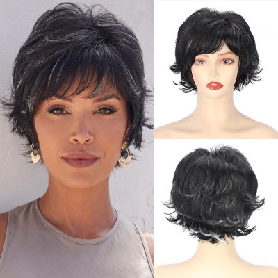 White new wig European and American women's short curly hair black and white mixed color reverse curling mechanism headpiece